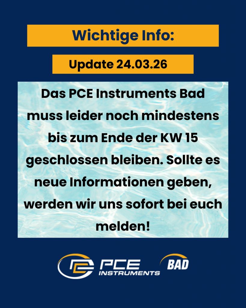 Im PCE Instruments Bad laufen unsere Reparaturarbeiten gerade auf Hochtouren. Doch leider können wir euch, Stand heute (24.03.26), noch kein genaues Öffnungsdatum verkünden.